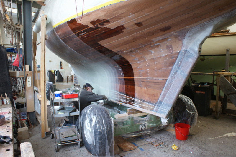 • Laminieren der Aussenhaut und des Ballastes da die Verleimung sämtlicher Eichenspanten (lamelliert) aufgegangen ist und die Demontage des Innenausbaus ausser Frage steht.